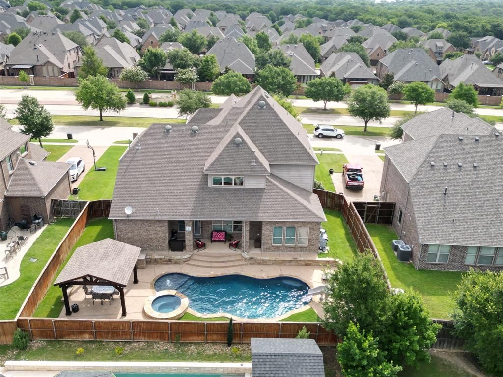 Welcome to this beautiful 5 bedroom, 4.5 bathroom home in the heart of Trophy Club, offering the perfect blend of elegance, comfort, and entertainment. Step inside to soaring ceilings and rich hardwood floors that flow throughout the main living areas. The spacious living room features a striking floor-to-ceiling stone fireplace and seamlessly connects to the breakfast nook and chef’s kitchen, which boasts granite countertops, a large center island, and ample cabinetry, ideal for everyday living and entertaining.The main floor includes a spacious primary suite with serene views of the pool, as well as a guest bedroom with a private ensuite, perfect for visitors or multigenerational living. Upstairs, you'll find three generously sized bedrooms, a large family-game room, and a massive media room ready for movie nights.Step outside and enjoy summer days in the sparkling pool complete with a spa, slide, pergola, and outdoor kitchen, your personal backyard retreat! Located in the desirable Northwest ISD with top rated schools, this home offers the lifestyle you’ve been dreaming of. Don’t miss your chance to own this Trophy Club gem!