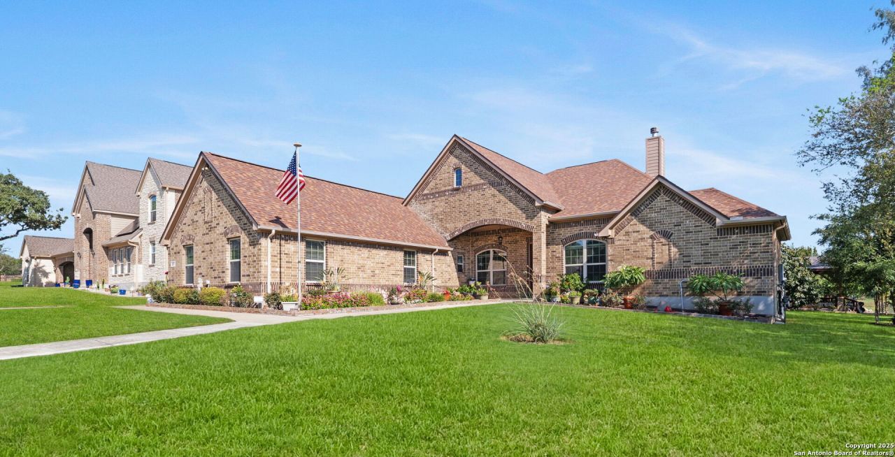 Stunning one-story retreat on one of the largest lots in the neighborhood with no back neighbors thanks to a natural greenbelt buffer. This home features 4 bedrooms, 3.5 bathrooms, and high ceilings throughout. The grand living room showcases a stone-and-brick fireplace, flowing seamlessly to a chefs kitchen with oversized island, upgraded vent hood, granite countertops, stainless steel appliances, walk-in pantry, breakfast nook, and bar area. Entertain with ease in the formal dining room, large front porch, oversized covered patio, and custom pavilion. The primary suite offers a spa-like retreat with double vanities, soaking tub, and separate shower. Secondary bedrooms include one en-suite guest suite and two connected by a Jack-and-Jill bath, each with private vanities. Additional highlights include an office/flex room, movie theater, and 3-car side-entry garage. Mature oaks and persimmons frame the backyard, creating a private and serene outdoor setting perfect for gatherings or relaxation.