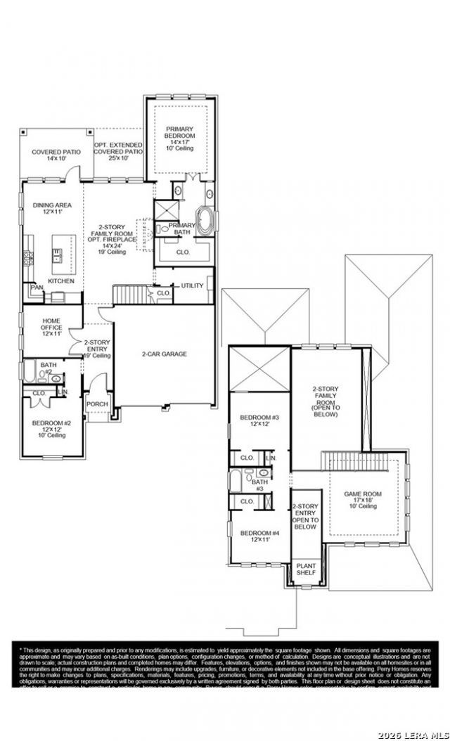 Home office with French doors set at two-story entry. Two-story family room with wall of windows and a wood mantel fireplace opens to kitchen and dining area. Kitchen hosts inviting island with built-in seating space, a 5-burner gas cooktop, and two wall ovens. First-floor primary suite includes dual vanities, freestanding tub, separate glass-enclosed shower and large walk-in closet in primary bath. A second bedroom is downstairs. Two secondary bedrooms and a game room are upstairs. Extended covered backyard patio. Two-car garage.
