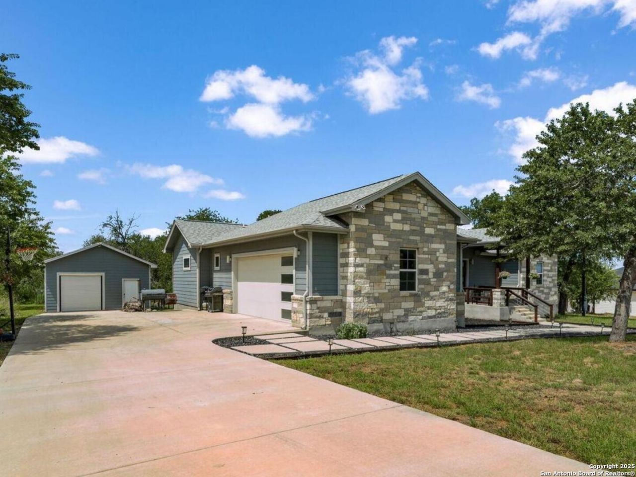 Welcome to Log Cabin Way, where modern design seamlessly blends with serene country living. Located on a large 1-acre lot, built in 2020 this home offers the perfect country feel while providing ease of travel and close proximity to San Antonio, TX - all without the burden of city taxes. Inside, youll find an open, entertainers dream floorplan filled with stylish upgrades and inviting spaces. Enjoy beautiful porcelain wood-look tile flooring throughout, elegant stone countertops, stainless steel appliances, and a classic subway tile backsplash that complements the sleek, oversized kitchen island - perfect for gatherings and casual dining. The newly designed primary bathroom is a true retreat, featuring a luxurious separate tub and shower and double vanities for added comfort and convenience. Step outside to a spacious deck ideal for entertaining or relaxing under the Texas skies. The fenced-in area is perfect for animals, offering flexibility for your lifestyle needs. An impressive additional building, measuring approximately 20 x 30 square feet, has been thoughtfully finished out, fully insulated, and equipped with cooling, kitchenette, full bathroom, making it versatile for projects, hobbies, or extra storage, a guest house, casita or a mother-in-law suite. Please note, the fence does not mark the full property line. This exceptional home provides the ideal balance of modern finishes, space, and tranquility on a generous 1-acre lot.. Dont miss the opportunity to make this stunning property your own. Schedule your showing today!