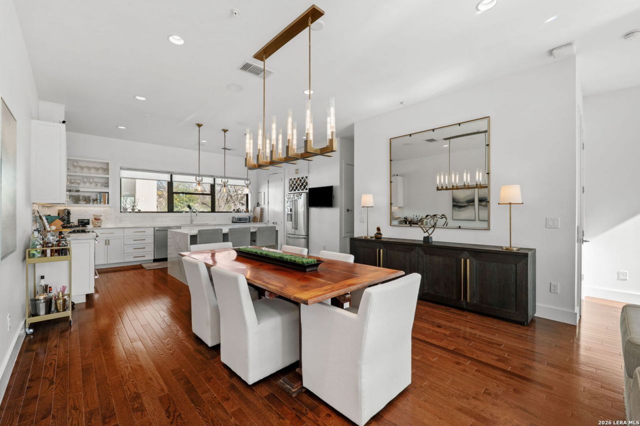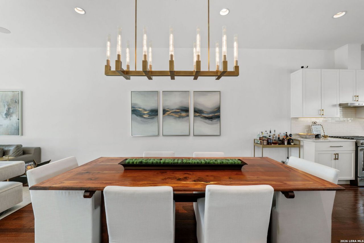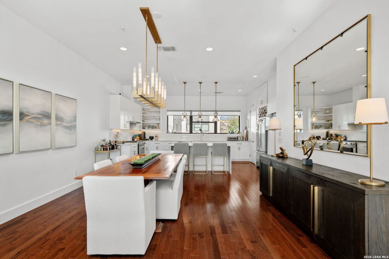 Offering signature styled relaxed luxury, this SOJO Commons urban brownstone in the beloved Pearl District offers abundantly spectacular upgrades and design enhancements classically curated to create the ultimate lock and leave lifestyle. Culinary performance kitchen features custom Arabescato quartz counters, stunning island with waterfall edge counter, KitchenAid appliances including gas cooking, separate beverage refrigerator, wine storage and custom built-in pantry shelving. Stunning primary retreat with pendant lighting, soothing spa quality bath with slate flooring, upgraded quartz counters with dual vanities, glass shelving/bench in the large walk-in shower and custom designed concept closet. Brilliant guest bathroom updates feature high quality cabinetry and custom closets and high-end marble countertops. Restoration Hardware contemporary fixtures, hardware and lighting. Smart home technology including app enabled door lock capability with camera, voice activated controls for lighting and window treatments. Residential elevator with enhanced cab detail and commercial style metal door. Unit amenities include an intimate rooftop deck with 360-degree city views, fire pit and extensive outdoor seating, a 2-car attached garage with 220V EV charger and epoxy flooring. SOJO Commons provides two gated vehicular entrances, personal pedestrian access gates and private swimming pool with outdoor cabana and grilling station. Celebrate living moments from The Historic Pearl and famed San Antonio Riverwalk - a cultural mecca offering entertainment, hospitality, shopping and restaurants.