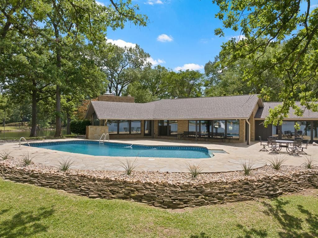 Completely reimagined inside and out, this extraordinary legacy property invites you to create generations of memories in one of Lake Bob Sandlin’s most breathtaking settings. Perched on approximately 2.5 acres at the tip of the peninsula, this rare offering boasts over 1,500 feet of shoreline, delivering unmatched panoramic water views and an unparalleled sense of privacy. With water visible from every window and multiple living and dining areas both inside and out, this nearly 4000 square foot home provides ample space for entertaining the masses. Outside, your private oasis awaits. Lounge in the shade or soak up the sun all on the expansive flagstone patio that draws you out of the house and wraps the pool connecting the two seamlessly. At the water, the private dock, and access to a private boat ramp provide additional lakeside amenities. Step through the foyer and into the formal living and dining where a statement fireplace creates a cozy intimate setting, while floor to ceiling windows flood the rooms with warm sunlight and allow nature to permeate the home. The kitchen features cabinetry galore, sprawling granite counters with bar seating, plus a breakfast nook that looks over the adjoining den and or dining area out to the water. The oversized primary suite includes its own fireplace to sit by, and an ensuite bath equally as spacious with a soaking tub, tile shower, dual vanities, and custom walk-in closet. Following suit are 2 well appointed guest rooms each with private bathrooms, and a bonus room with a full wet bar and endless possibilities. The property also includes a 2,400 square foot shop with electricity and roll-up doors, perfect for added covered parking, boat storage, or hobbies. Immerse yourself in lake life today!