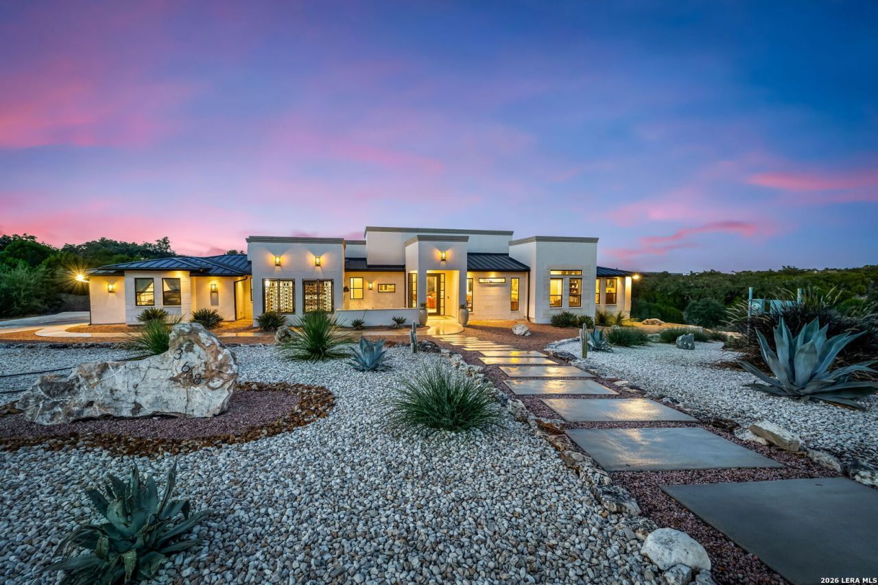 Nestled on a serene cul-de-sac in the prestigious Vintage Oaks community, 368 Butternut Way is an exquisite custom-built KC Custom home perched on a private 2.22-acre lot backing to greenbelt with breathtaking panoramic Hill Country views. This 4-bedroom, 3-bath, 3,576 sq ft residence masterfully blends refined Frank Lloyd Wright inspired elegance with modern efficiency and superior craftsmanship. A beautifully xeriscaped front yard and welcoming courtyard featuring a Zsolnay fountain set a striking tone. Step inside to soaring ceilings accented by warm cedar beams, French art deco chandeliers and lighting, architectural details in the dining and media rooms, and abundant natural light. Tile flooring flows through main living areas, complemented by rich custom hardwood in the bedrooms-one of which includes built-in bookshelves, perfect for a home office or study. The expansive open-concept living space centers on a cozy gas fireplace and a dramatic wall of windows framing the lush greenbelt beyond. The heart of the home is a true gourmet chefs kitchen, boasting Benedettini custom cabinetry, quartzite countertops, top-tier JennAir professional-grade appliances, a 6-burner double gas range, dual dishwashers, microwave with speed oven, an oversized island with sink, and an second farm sink with serene views. A generous 60 sq ft fully shelved pantry, complete with a full-size refrigerator, provides more than sufficient organized storage. Energy independence meets luxury with a powerful 10.75 kW solar power system featuring 25 high-efficiency panels, seamlessly paired with a 13.5 kWh Tesla Powerwall 3, delivering enough clean, reliable energy to cover nearly all your homes electricity needs year-round-nearly eliminating bills and enhancing resilience. Retreat to the primary suite with tranquil views and a thoughtfully designed custom closet that doubles as a secure safe room. Outdoor living is exceptional: a pavilion room with natural gas fire table, hacienda-style cedar beams, a sparkling resort-style pool, 1,200+ square feet of patio, and fully equipped outdoor kitchen with sink and gas grill, all enveloped by mature 150-year-old live oaks, sycamores, and native Hill Country plantings. An oversized two-car garage rounds out the practical features. Enjoy Vintage Oaks resort-level amenities: multiple pools, lazy river, sports courts, walking trails, neighborhood clubs, social events, and concerts. (Sellers also own the adjacent 1.19-acre lot, available for purchase.) This exceptional property offers privacy, sophistication, sustainability, and space far beyond the ordinary-perfect for discerning buyers seeking the best of Texas Hill Country living.
