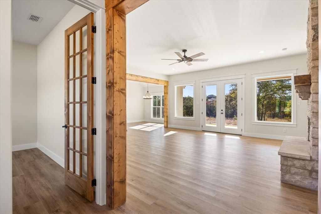 Discover luxurious country living in this stunning new-build home set on 2 serene acres, thoughtfully designed with upscale finishes and custom details throughout. From the moment you walk in, you’ll feel the craftsmanship—soaring ceilings, an open-concept layout, and an elegant flow that blends modern style with timeless warmth. The gourmet kitchen offers abundant counter space, beautiful cabinetry, under-cabinet lighting, and a layout made for both everyday living and effortless entertaining. The living area is spacious and inviting, surrounded by windows that frame the peaceful acreage outside. Retreat to the luxurious primary suite, where relaxation takes center stage. The spa-inspired bathroom features a show stopping walk-in shower with teak wood accents on the ceiling, creating a warm, natural, resort-like feel. Thoughtful touches, elevated materials, and high-end design make this suite a true sanctuary. With 2 acres to call your own, the possibilities are endless—build a workshop or simply enjoy the quiet beauty around you with a seasonal pond. Ideally located approximately 20 minutes to Granbury or Stephenville, you can enjoy the privacy of country living without sacrificing convenience. Located in the desirable Mountain Lakes community, you’ll also enjoy access to two private lakes, a community pool, and more. A rare blend of luxury, craftsmanship, and space—this home is ready to welcome you.