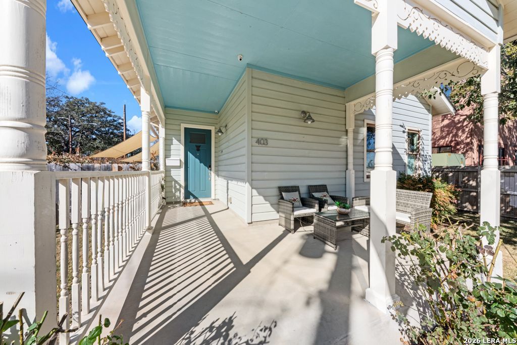 Set on an oversized corner lot in the heart of historic Dignowity Hill, this lovely Folk Victorian style, modern bungalow offers a rare combination of privacy, quiet, and architectural character just minutes from downtown San Antonio. Built in 2018, the home reflects the charm of early neighborhood design while delivering modern efficiency, thoughtful upgrades, and intelligent use of space. Across the street lies the historic San Antonio cemetery grounds, encompassing over 100 acres of preserved open space. Dignowity Hill was stablished in the late 1800s and was originally subdivided into large estate-sized lots for prominent residents, laying the groundwork for what became the citys first exclusive residential neighborhood. Today, the area is recognized as a historic district celebrated for its architectural legacy, mature landscape, and enduring sense of place. The presence of the cemetery creates a uniquely peaceful backdrop, offering long-term privacy and unobstructed views, offset by the energy of nearby East Houston Street. The home features high ceilings, engineered wood floors, an open-concept kitchen with quartz countertops, custom wood cabinetry, stainless steel appliances, and a spacious laundry room. An inviting covered front porch and airy Florida room extend the living space. Secondary bedrooms are connected by a Jack-and-Jill bath, and custom top-down/bottom-up window shades with light-filtering and blackout options are installed throughout. Outdoor spaces are thoughtfully designed and fully fenced, featuring dog fencing with removable panels, zoysia grass, picket fencing in the front yard, and privacy fencing near the driveway. The backyard includes hardscaping, a deck, and exterior lighting, while the side garden offers a gated entry, raised beds, irrigation, rain barrel, dry potting sink, shade screens, and gutters. A gated driveway accessed from the side street provides additional concrete parking and enhanced privacy, with a county office building next door further contributing to the quiet setting. Two heated and cooled sheds/workrooms with electricity provide flexible space for storage, hobbies, or office use, including a dedicated toolroom with a portable AC unit. Additional upgrades include a tankless water heater, electric vehicle charging plug, upgraded electrical panel supporting the sheds and charging plug, water softener, upgraded interior and exterior lighting, and a interior/exterior security camera system. Featured on HGTVs House Hunters in 2019, this home is a rare offering in one of San Antonios most iconic historic neighborhoods, conveniently located near downtown, the Pearl, Blue Star, the River Walk, the Alamodome, Fort Sam Houston, major freeways, and the highly anticipated Project MARVEL.