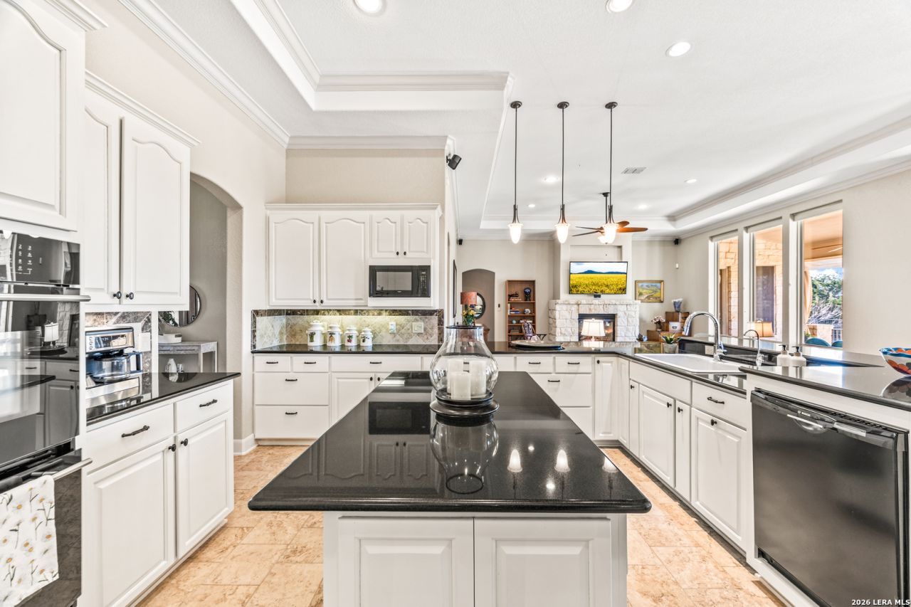 Situated on a premium one-acre lot, this single-story home offers quality construction, thoughtful design, and the privacy todays buyers seek. Built with 2x6 construction for enhanced durability and insulation, the residence combines timeless materials with modern updates. A one-year-old roof and recently installed water heaters provide peace of mind, while a 3.5-car garage offers generous space for vehicles, storage, or a workshop. High ceilings and fresh paint throughout the home create an open, light-filled atmosphere. The main living areas are seamlessly connected. The kitchen, dining area, and family room support both everyday living and entertaining. A fireplace anchors the family room, adding warmth and character. The kitchen features recently painted cabinetry for a clean, contemporary look, and flows naturally into the central gathering spaces where family and guests can comfortably connect. The home includes two spacious secondary bedrooms joined by a large Jack and Jill bathroom, providing functionality and comfort. A dedicated office overlooking the front porch offers an ideal work-from-home setting with cherry wood floors that continue into the formal dining room, reflecting attention to craftsmanship and detail. Marble countertops in the bathrooms further highlight the quality finishes rarely found in todays builds. The private primary suite is thoughtfully positioned for maximum seclusion. Remote-controlled Mikkita blackout curtains allow for complete light control, enhancing comfort and rest. Outdoors, an ample tiled front porch overlooks a tranquil water fountain, creating a peaceful setting for morning coffee. The extended covered back patio captures sweeping views and memorable sunsets, with a propane connection ready for grilling. Deer sightings and open skies contribute to a true sense of retreat. A built-in Bose sound system services both interior and exterior spaces through four remote-controlled zones, supporting an elevated indoor-outdoor lifestyle. Every finish reflects careful attention to detail, reinforcing the homes quality and long-term value. Located just minutes from Hwy 281, the property offers convenient access to San Antonio, as well as an easy commute to Austin, New Braunfels, and Boerne. This is the lifestyle buyers search for: single story, high ceilings, large lot, privacy, modern updates, quality construction, and a prime location with room to live, work, and entertain.