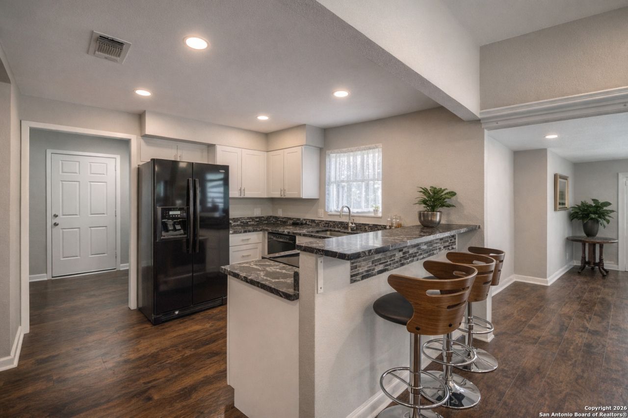 This ideal single-story home features 3 bedrooms, 2 bathrooms, and a 2-car garage, offering a functional layout ideal for homeowners or investors alike. Home is virtually staged to show potential. The kitchen is equipped with matte-finish granite countertops and appliances, providing a modern and durable workspace. The home offers laminated wood flooring throughout and a spacious primary suite with direct access to the backyard, creating a private retreat. The roof and gutters were replaced approximately six years ago, adding peace of mind for future ownership. Step outside to a large backyard complete with an above-ground pool, perfect for outdoor enjoyment, entertaining, or tenant appeal. Conveniently located with quick access to the Air Force base, nearby shopping centers, grocery stores, and IH-35, this property is well positioned for strong rental demand and long-term value. Previously operated as a long-term rental, this home presents a great investment opportunity. The property is being sold as-is and is priced competitively for a quick sale, making it an excellent option for investors or owner-occupants ready to add value.