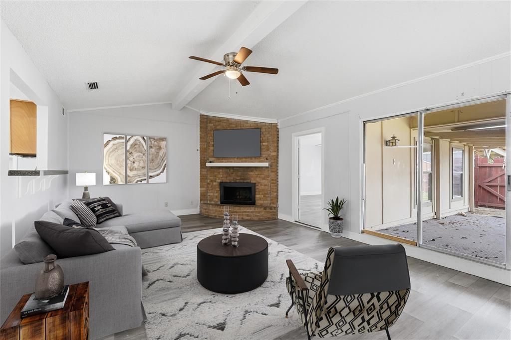 Experience the perfect blend of space and potential in this Garland gem, where vaulted ceilings and a cozy brick fireplace welcome you into a home designed for effortless living. The open floorplan flows beautifully, anchored by luxury vinyl plank flooring and a neutral color palette that serves as the perfect canvas for your personal style. The kitchen is a functional dream for the home chef, graced with stainless steel appliances, a pantry, and ample cabinetry for all your storage needs. Retreat to the convenience of two main-floor bedrooms, including a primary suite with a generous walk-in closet and a flexible secondary bedroom that serves as an ideal nursery or quiet home office. The main level is anchored by a massive game room that offers endless possibilities for a home theater, gym, or expansive play space. Secluded for ultimate privacy, the second floor features two additional bedrooms and a full bath, providing a dedicated wing for guests or family members. Practicality meets lifestyle with an oversized utility room boasting built-in cabinets and space for an extra fridge, ensuring every chore is a breeze. Outside, your private backyard with mature trees and a covered patio provides a peaceful escape, complete with a storage shed and an attached carport. Nestled in a quiet subdivision with easy access to I-30, this home offers a quick commute to downtown Dallas while providing the space you have been searching for. Take a first-person look at this gorgeous home! Click the Virtual Tour link to see the 3D Tour!