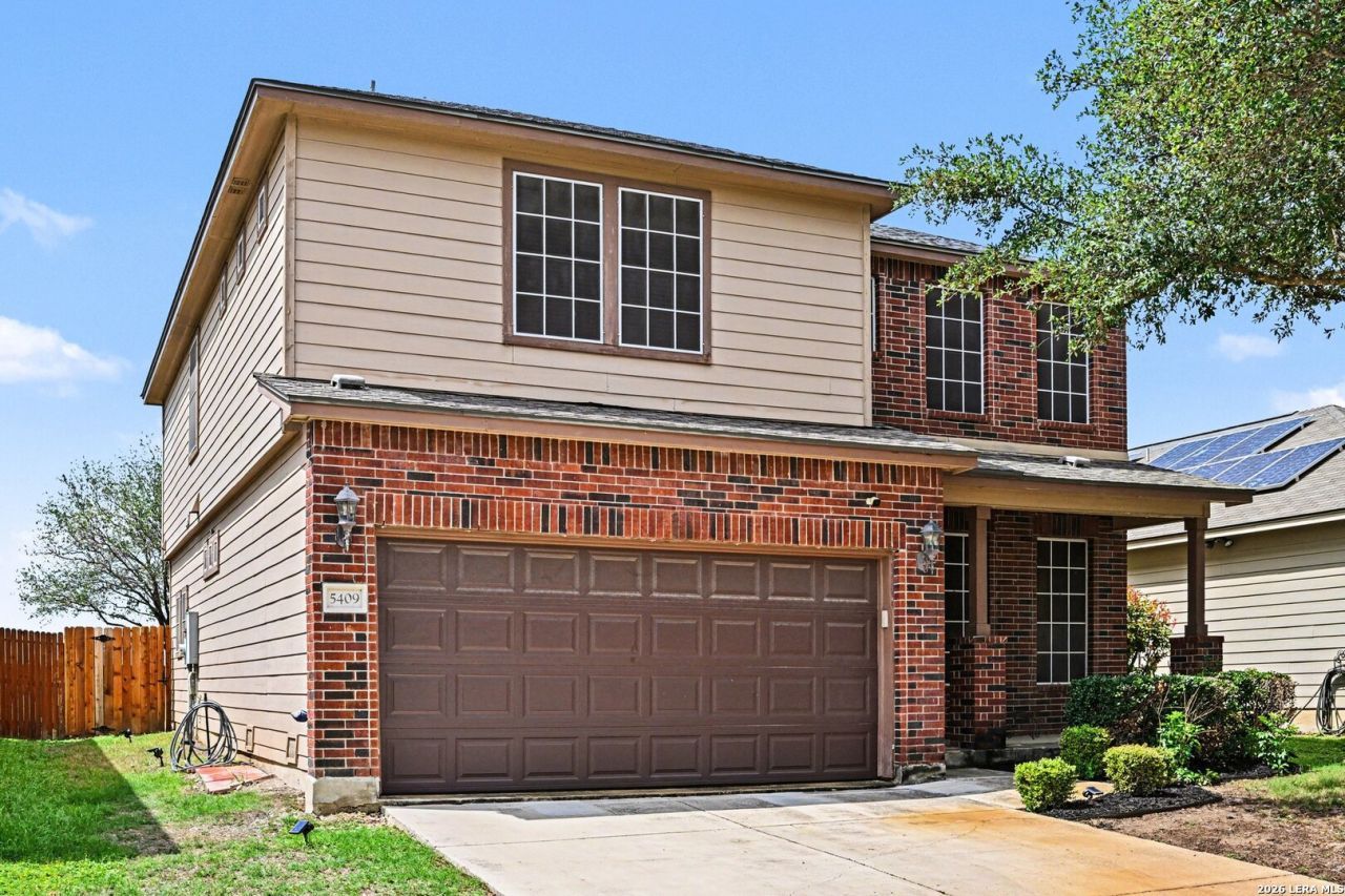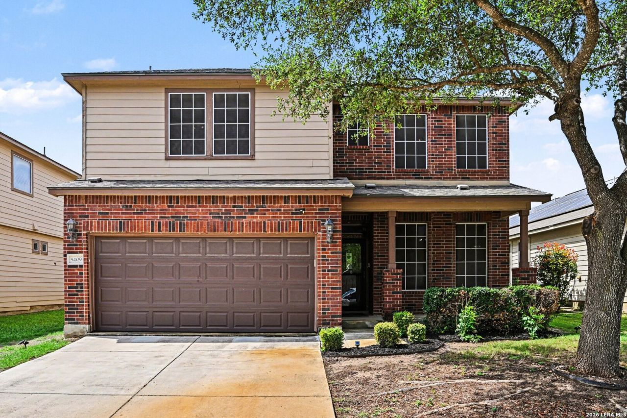 Welcome to 5409 Caraway Bend in The Ridge at Leon Valley. This well cared for Tri-Stone home offers 3 bedrooms, 2.5 baths, and 2,260 square feet of comfortable living space. The layout gives you room to spread out while still feeling connected. The kitchen features 42 inch cabinets, updated appliances, and a recently replaced sink, opening into the main living area with crown molding that adds a nice touch. Downstairs was painted a few years ago and has been well maintained. You will notice right away that this home has been taken care of. Major updates include a roof replaced in 2017, a 50 gallon water heater replaced in 2025, and an air handler that is about 7 years old. The HVAC, stove, and water heater are all electric. Energy efficiency features include double pane windows, solar screens, and a radiant barrier in the attic. The home also has a water softener in place. Flooring is laminate and tile throughout, with carpet only in the primary closet. Ceiling fans are installed in every room for added comfort. Step outside to a 10 by 10 covered patio and a private backyard with a 6 foot cedar fence that was just replaced in 2025. The exterior features Hardiplank siding on three sides with brick on the front, giving it both durability and curb appeal. The front door also includes a storm door. The garage door and opener were replaced about 3 years ago. Washer and dryer can convey. Refrigerator does not convey. This is a solid home with the big ticket items already handled, located in an established neighborhood with easy access to everything Leon Valley has to offer.