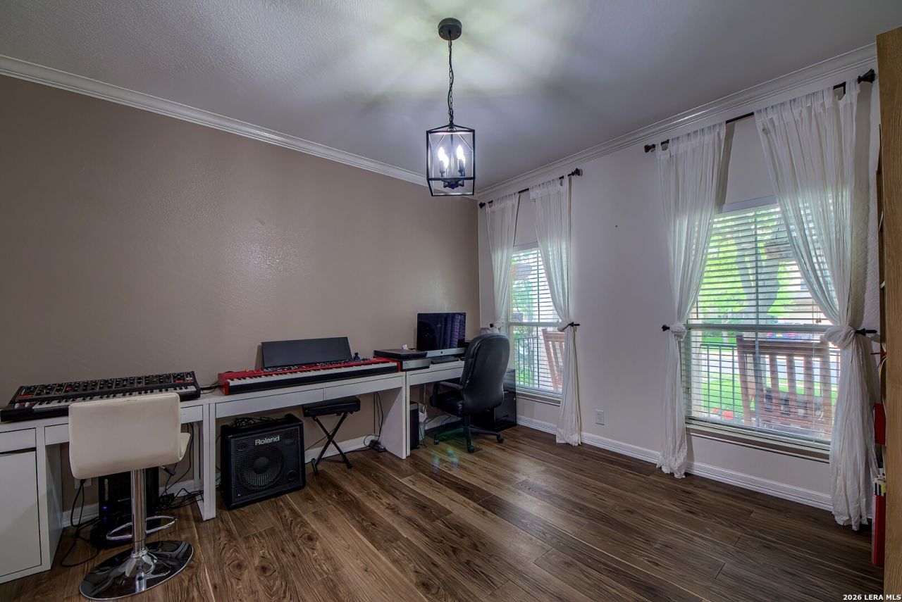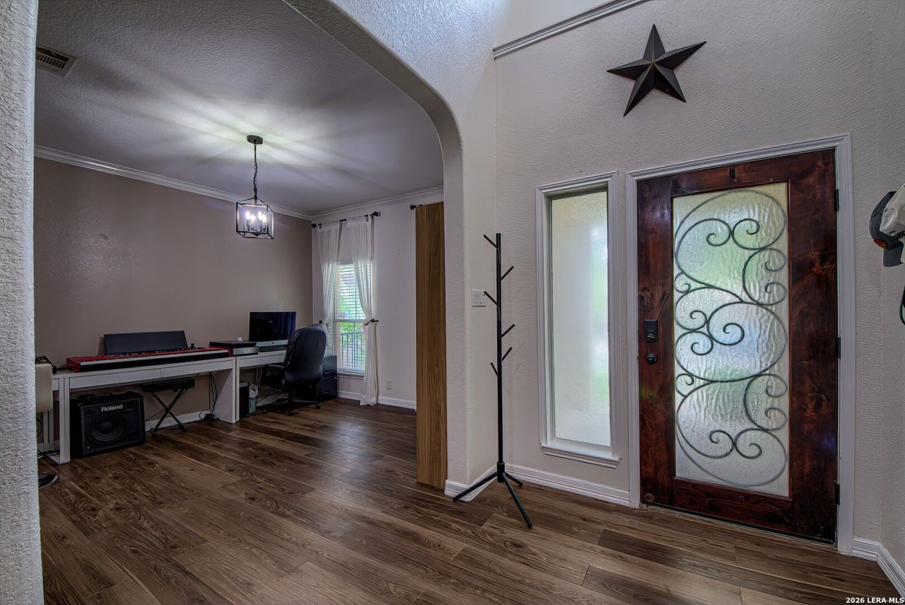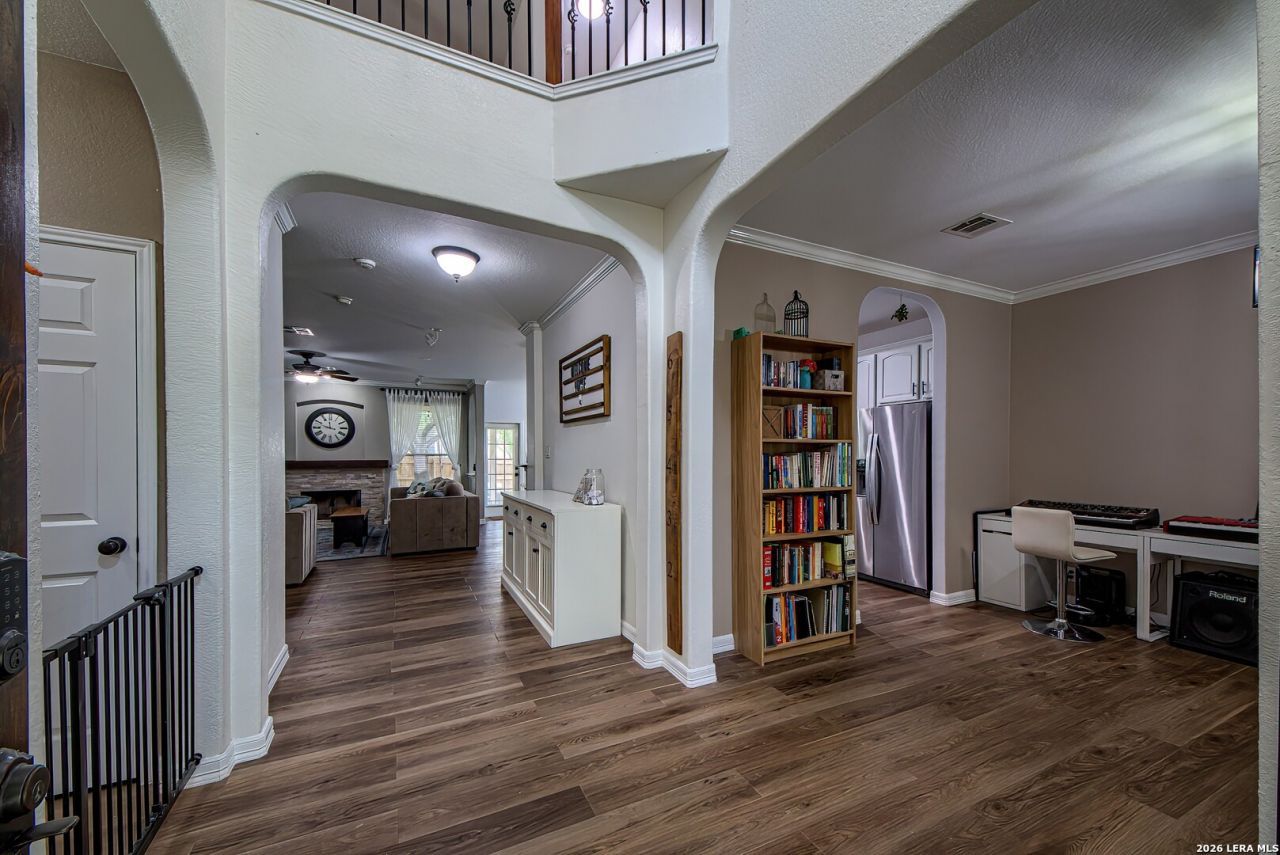 This extremely spacious Texas-style home offers 5 bedrooms, 3.5 bathrooms, and over 3,100 square feet of well-designed living space-an absolute must-see. An inviting front porch leads into a grand foyer, creating a warm welcome for family and guests alike. Inside, youll find multiple living and dining areas, perfect for both everyday living and entertaining. The custom kitchen features beautifully crafted cabinetry, a subway tile backsplash, dark granite countertops, and a stylish pantry door that adds character to the space. The main living room is pre-wired for a surround-sound system and features a wood-burning fireplace, adding both comfort and ambiance. The primary suite is conveniently located downstairs, privately split and highlighted by a charming bay window. The en-suite bathroom includes dual vanities and a separate tub and shower, with a jetted jacuzzi tub for added relaxation. The thoughtfully designed closet features built-in cabinetry for optimal organization. Upstairs, a spacious secondary living area provides the perfect setting for entertainment or relaxation, separating two bedrooms and a full bathroom on each side for added privacy. All bedrooms are generously sized, and the multiple bathrooms offer convenience for larger households. Step outside to enjoy the large covered patio-ideal for relaxing summer evenings or hosting gatherings. Neighborhood amenities, including the pool and playground, are within easy walking distance.