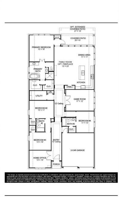 Welcoming front porch opens into an extended entryway adorned with 12-foot ceilings. French doors open into the private home office, located just off the entrance. Down the hallway, you will find the secondary bedrooms, each featuring walk-in closets and a shared full bathroom. Adjacent to the hallway, French doors open into the inviting game room, complete with three large windows. The open family room, featuring a wall of windows and a wood mantel fireplace seamlessly leads into the designated dining area. The corner kitchen boasts an inviting island with built-in seating, a 5-burner gas cooktop, and a walk-in pantry. Entering the primary bedroom, you are greeted with ample natural light from the three large windows. French doors lead into the primary suite, showcasing dual vanities, a freestanding tub, a glass enclosed shower, and two walk-in closets. A guest suite with a walk-in closet and private full bathroom is located off the main hallway. The utility room with an included linen closet is conveniently located adjacent to the game room. Outside includes a covered backyard patio. Completing the home is a two-car garage.