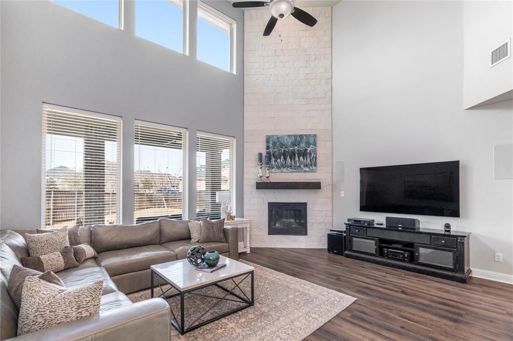 *3-CAR GARAGE!!*ARGYLE ISD!!*CORNER LOT!*4 BED + OFFICE + GAME ROOM!* Lower Tax Rate, No PID, No MUD - HUGE SAVINGS!Located in the highly desirable Canyon Falls community and zoned for acclaimed Argyle ISD, this beautifully designed 4-bedroom, 3.5-bath home offers refined living in one of the area’s most sought-after master-planned neighborhoods. Situated on a spacious corner lot with generous yard space, this home welcomes you with soaring 20-foot ceilings in the main living area, abundant natural light, and a dramatic floor-to-ceiling stone-look fireplace with gas logs. Luxury Vinyl Plank flooring flows throughout the main living areas, complemented by modern recessed lighting and a seamless open-concept design ideal for both everyday living and entertaining. The kitchen showcases a sophisticated modern aesthetic with two-tone cabinetry, crisp white upper cabinets, expansive quartz countertops, and a sleek subway tile backsplash. A large island with storage and breakfast bar anchors the space, along with an eat-in dining area featuring a built-in desk. Stainless steel appliances include a built-in gas oven and microwave, 5-burner gas cooktop with a vent hood. The dedicated office provides a private work-from-home retreat, while the upstairs game room offers additional flexible living space perfect for relaxing or hosting guests. The spacious primary suite features elegant tray ceilings, abundant natural light, and a thoughtfully designed ensuite bath with a garden soaking tub, oversized walk-in shower with tile surround and bench, and an expansive dual-sink vanity offering generous storage and counter space. All secondary bedrooms are located upstairs in a split floorplan layout, providing privacy and versatility. Residents of Canyon Falls enjoy resort-style amenities including multiple pools, scenic walking and biking trails, parks, a fitness center, and year-round community events—offering an elevated lifestyle in a premier location.