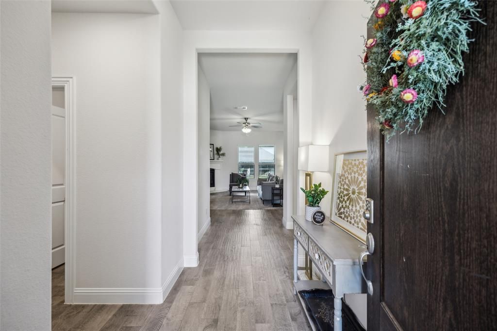 Zoned for NEW Richland High School! Stunning 4-Bedroom Home in Sought-After Prosper ISD! This beautifully maintained home shows like new and features a spacious open-concept layout with a desirable split floor plan. The inviting entry leads to a bright living area with wood-look tile flooring throughout the main living areas. The generously sized master suite offers a serene retreat with an ensuite bathroom that includes a garden tub, separate shower, dual sinks, and a large walk-in closet. Three additional bedrooms provide ample space for family or guests. Enjoy the convenience of a separate utility room with built-in cabinetry. Step outside to a private, oversized backyard—perfect for entertaining or relaxing. Located near the new fire station and zoned for the brand-new Moseley Middle School and Richland High School, both opening Fall 2025. Solar panels help keep the utility costs to a minimum! This home is the perfect blend of comfort, style, and location! Convenient to Dallas North Tollway with a variety of shops & restaurants as well as just minutes from the New Omni PGA Hotel and Entertainment district and upcoming Fields West!
