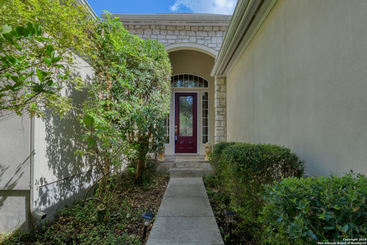 Imagine starting your day with a cup of coffee on the covered patio, the sound of water cascading from the stone waterfall into the sparkling pool and spa. Surrounded by lush greenery and mature trees, the backyard feels like your own private retreat - the perfect place to begin or end the day. From the moment you arrive, the home welcomes you with a manicured front lawn and a stucco exterior accented with stone details. The charming front porch and decorative glass door set the stage for whats inside. Step through the entry into a bright foyer with soaring ceilings, tile flooring, and elegant double glass doors that open into a versatile office with warm wood flooring and built-in cabinetry. With its closet, this space easily adapts into a fifth bedroom if needed. As you move into the heart of the home, sunlight pours through large arched windows in the living room, where soaring ceilings and striking architectural columns frame a cozy fireplace - a perfect spot to gather on cooler evenings. Just beyond, a second living area off the kitchen invites relaxation, complete with another fireplace and built-in shelving for books, photos, or decor. Morning light fills the breakfast area, where backyard views create a serene backdrop for everyday meals. The flow continues into the island kitchen, a hub designed for both cooking and conversation. With granite countertops, abundant cabinetry, a prep island, built-in oven and microwave, and a gas cooktop, its a space ready for both weeknight dinners and weekend entertaining. Tucked away for privacy, the downstairs primary suite offers a peaceful retreat with wood flooring, a tray ceiling, oversized windows looking out to the backyard, and private outdoor access. In the spa-like bath, dual vanities, a makeup counter, a walk-in shower, and a jetted corner soaking tub create a perfect place to unwind. The large walk-in closet keeps everything neatly organized. Also downstairs, two secondary bedrooms feature large arched windows, ceiling fans, and neutral finishes, with a full bathroom nearby. Upstairs, the flexible game room awaits - a bright space with built-in cabinetry and multiple windows, ideal as a media room, playroom, or workout area. A fourth bedroom and another full bathroom with updated tilework and a walk-in shower complete the upper level. A huge attic above the 3-car garage provides excellent storage. Evenings practically beg to be spent outside, whether dining under the covered patio or lounging poolside while the sun sets behind the trees. With flagstone decking, a sparkling pool and spa, and the calming sound of the rock waterfall, the backyard is designed for both relaxation and gatherings with friends and family. Beyond the home, convenience is at your fingertips - close to endless shopping and dining options, and just minutes from two of San Antonios largest employers, USAA and Valero. And with no HOA, youll enjoy the freedom and flexibility to make this home truly yo