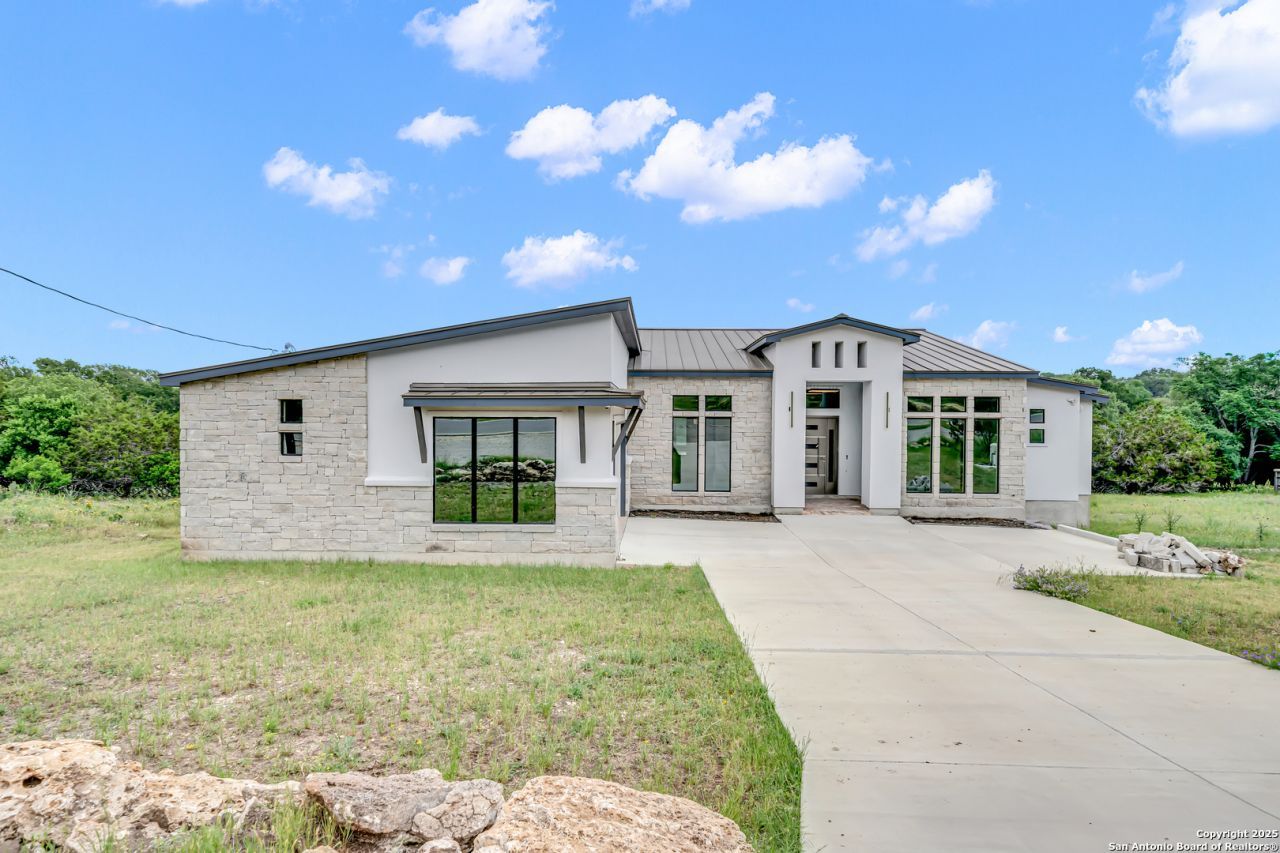 Discover refined Hill Country living in this stunning custom home nestled on nearly half an acre in the sought-after Rivermont subdivision of Spring Branch, Texas. This elegant 3,306 sq ft residence blends luxury and comfort, with soaring 12-foot decorative ceilings, recessed lighting throughout, and ceiling fans in all bedrooms. Featuring 3 spacious bedrooms, 3.5 bathrooms, and a dedicated home office, every detail has been thoughtfully curated for upscale living. The open-concept living area boasts a sleek electric fireplace and surround sound, ideal for relaxing or entertaining. A state-of-the-art security system and water softener add to the homes modern conveniences. The chefs kitchen is a showstopper, complete with custom cabinetry, cabinet underlighting, quartz countertops, and premium KitchenAid appliances including a built-in oven and microwave. Retreat to the serene primary suite featuring its own fireplace and private patio access. The luxurious en-suite bath showcases imported Italian marble in the oversized walk-in shower, dual vanities with quartz counters, and a soaking tub. A generous walk-in closet includes custom shelving and drawers for ample storage. Each secondary bedroom includes its own private full bath adorned with high-end marble finishes. Additional highlights include an oversized, fully insulated 2-car garage with finished flooring, metal roof, and a well-appointed laundry room with quartz counters and sink. Step outside to your covered back patio with cedar ceiling, recessed lighting, dual ceiling fans, and wrought iron railing-perfect for enjoying views of the nearby community pool, tennis and basketball courts. Located within a mile of a local winery and the Guadalupe River, this home also offers private river access with picnic spots and walking trails just minutes away. Buyers and their agents should independently verify all room sizes, taxes, and school information.