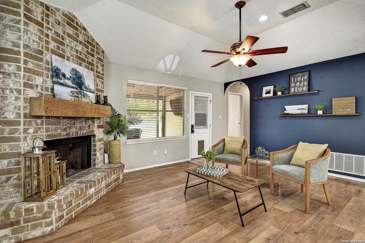 Solar panels are fully owned and convey!! Welcome to this charming one-story home nestled on a peaceful lot. This home is the perfect blend of comfort and character. Featuring 4 bedrooms with new carpeting and 2 well-appointed bathrooms. This home boasts an inviting open-concept layout ideal for both everyday living and entertaining. The beautifully renovated kitchen serves as the heart of the home, complete with a cozy eat-in dining area featuring a built-in L-shaped bench-adding both charm and functional seating. The kitchen flows seamlessly into the living area anchored by an inviting fireplace. Step outside to a private deck-perfect for morning coffee or evening gatherings. This home is minutes away from HEB, gas stations, restaurants & schools. Warm, welcoming, and full of character, this sweet home is ready to create lasting memories. Schedule a viewing today.