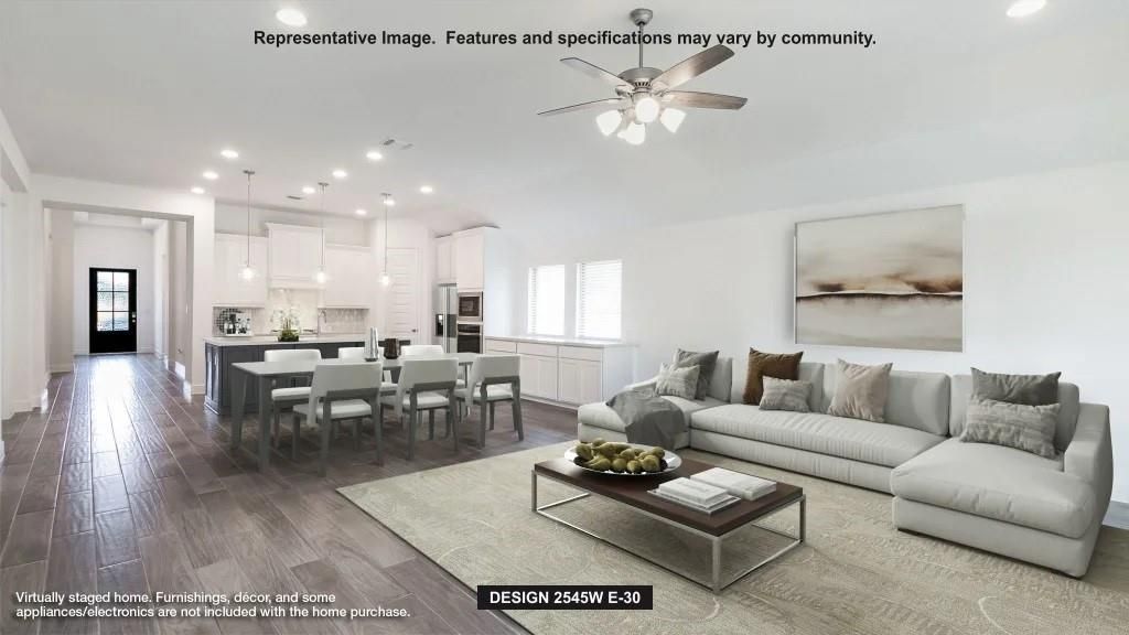Extended entry with 13-foot ceiling leads to open kitchen, dining area and family room. Kitchen offers generous counter space, a 5-burner gas cooktop, double wall oven, corner walk-in pantry and inviting island with built-in seating space. Dining area flows into family room with wall of windows and a wood mantel fireplace. Game room with French doors just across from kitchen. Primary suite includes double-door entry to primary bath with dual vanities, a freestanding tub, separate glass-enclosed shower and two large walk-in closets. Secondary bedrooms feature walk-in closets. Covered backyard patio. Mud room off two-car garage.