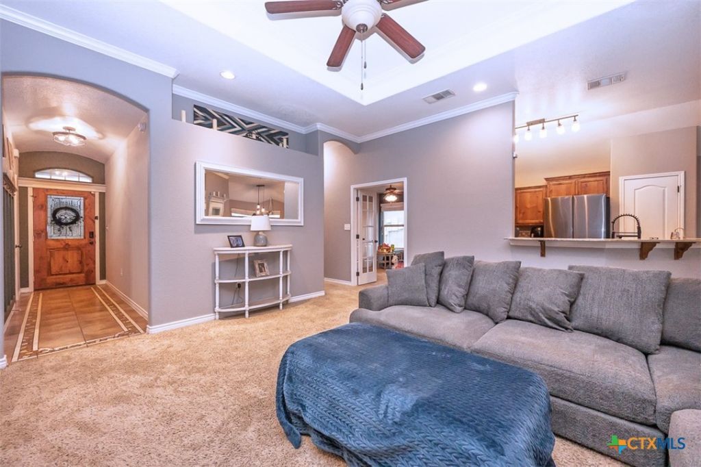 Located in a quiet neighborhood that keeps you close to everyday conveniences, this home offers the kind of space and comfort that makes life feel a little easier from the moment you arrive. Mornings can start with a short walk to the nearby elementary school or playgrounds, while evenings are best spent unwinding in a home designed to bring people together. Step inside to an open floor plan with high ceilings that immediately create a sense of space. Tray ceilings add character to both the great room and the owners suite, while a bold white stone fireplace anchors the living area as a natural gathering place. Just off the great room, French doors open to a flexible space that works beautifully as a home office, giving you the option to work or create in a quiet, separate setting. The kitchen is built for both function and connection, featuring a wraparound breakfast bar that invites conversation and an attached dining area filled with natural light. Whether its a quick weekday meal or a weekend get-together, this space adapts with ease. The owners suite offers more than just a place to rest, with an additional sitting area that could serve as a library, nursery, or private retreat. The en-suite bath is designed for relaxation with a jetted tub, separate shower, and room to recharge at the end of the day. Out back, the covered patio extends your living space outdoors, complete with added ceiling fans to keep things comfortable year-round. Thoughtful upgrades throughout the home, including enhanced lighting, built-in shelving, and a custom board and batten accent wall in the entry, bring both style and function together in a way that feels intentional and welcoming. This is a home that balances everyday practicality with inviting spaces to live, work, and relax?all in a location that keeps you connected to what matters most.