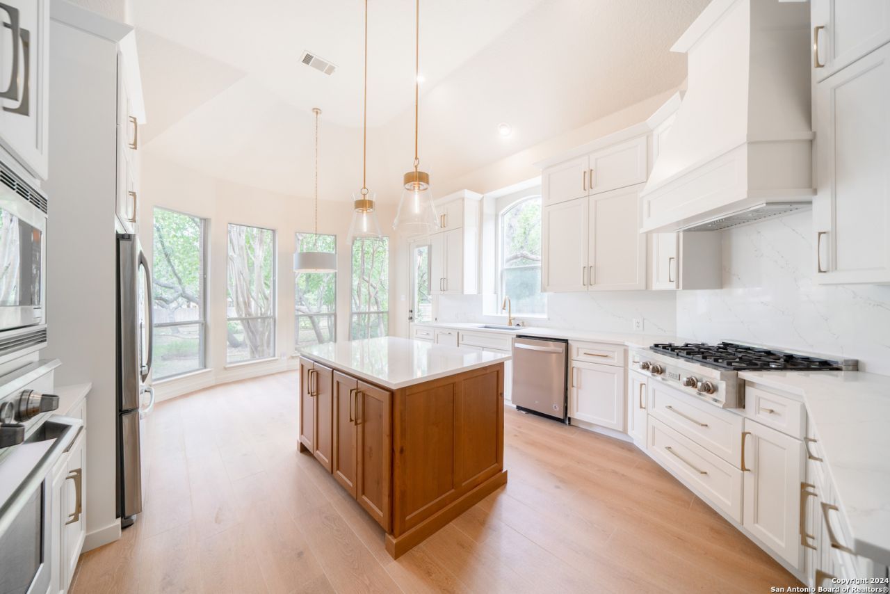This stunning, beautifully remodeled 3-bedroom, 2-bath home in the highly sought-after Steeple Brook neighborhood is a single-story gem. This home boasts a modern, open floor plan with high ceilings, an expansive living area, and a dedicated dining room. The newly renovated eat-in kitchen features brand new custom cabinetry by Michael Edwards, sleek countertops, a spacious island, breakfast bar, and modern appliances-perfect for entertaining guests. All three bedrooms are conveniently located on the first floor, offering abundant natural light and walk-in closets for ample storage. The home includes a versatile study/library, a functional utility room, and gorgeous new flooring throughout. The recent updates continue with fresh paint, a new fireplace, stunning mirrors, and thoughtfully selected top-of-the-line fixtures from Lighting Inc. Upgrades include new lighting in the bathrooms, outdoor sconces, a chandelier at the front entry, and modern lighting throughout all bedrooms, the study, and the dining room. Step outside to enjoy the lush, fully-treed backyard, offering a serene space for outdoor relaxation or hosting gatherings. The home also features new outdoor lighting, pre-wired security, energy-efficient ceiling fans, and a gas 4 burner stove for modern convenience. This move-in-ready property is the perfect retreat, set in a peaceful, established community. Washer, dryer, and refrigerator are included, making this a truly turnkey home.