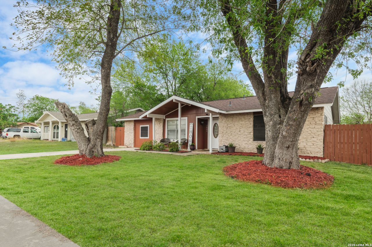 Thoughtfully updated single-story home with a spacious open layout and stylish modern touches throughout. The living area features recessed lighting and custom ceiling details that create a warm, elevated feel while flowing effortlessly into the dining area and kitchen with generous cabinetry, abundant counter space, and large windows that bring in natural light. The flexible floor plan offers comfortable bedrooms and well-appointed baths, with durable flooring and neutral tones that make the home completely move-in ready. The backyard is built for entertaining. A large covered patio opens to an outdoor kitchen setup complete with a bar area and bar fridge, creating the perfect space for weekend gatherings, game days, or relaxed evenings outside. Mature trees provide shade and privacy while the oversized yard offers plenty of room to enjoy. Transferable foundation warranty provides added peace of mind for the next owner. Convenient access to Randolph Air Force Base, IH-35, Loop 1604, The Forum shopping and dining district, IKEA, and major retail along the Northeast corridor.