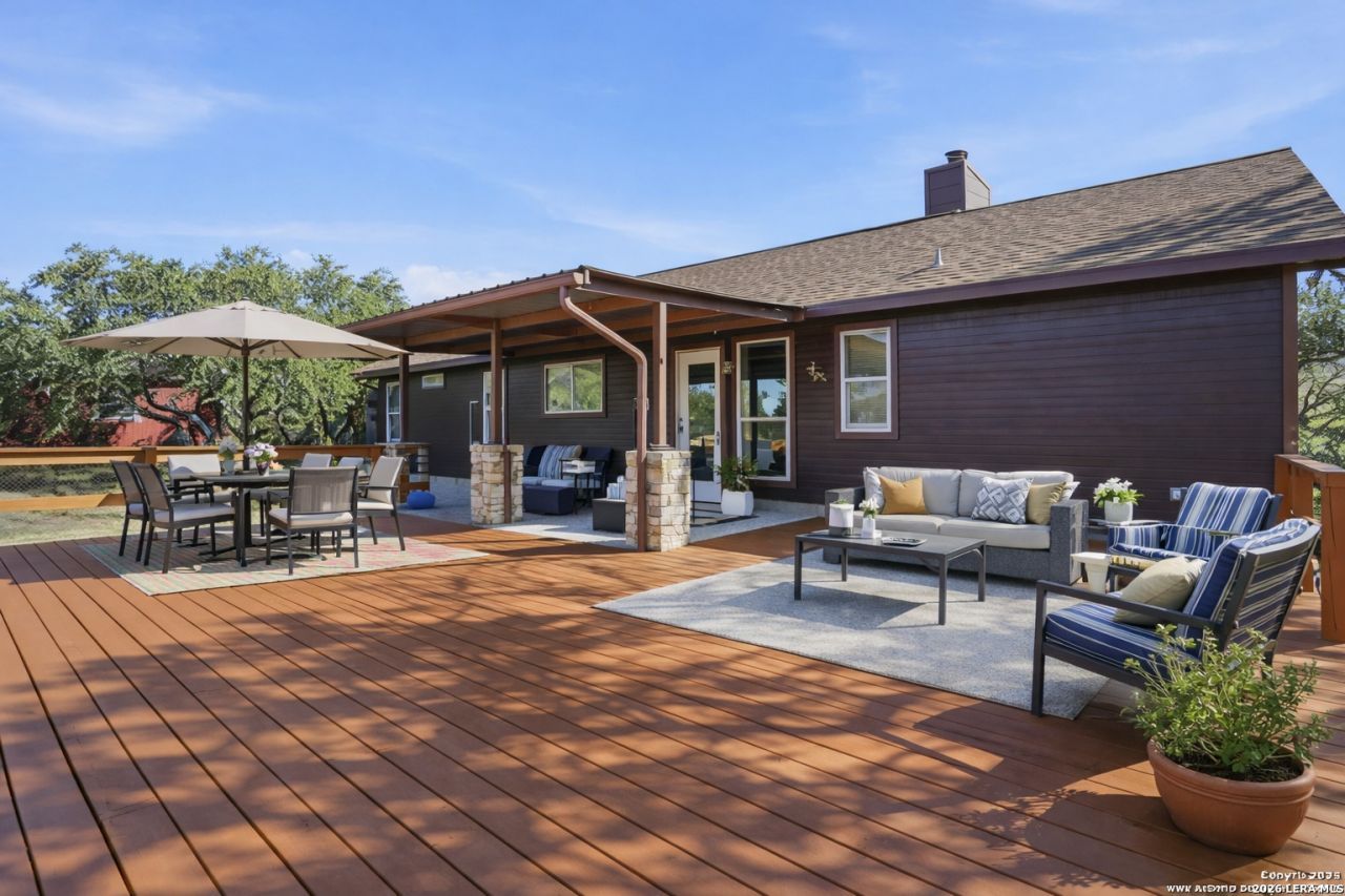 Home on 5.4 beautiful acres just about 20 minutes from Wimberley, this Hill Country property features a charming single-story ranch home plus a 200sqft (estimated) studio building with power and water-ideal for a home office, art studio, workshop, or private retreat. Step outside to a large back deck overlooking the oak-covered acreage-perfect for morning coffee, evening sunsets, or weekend gatherings. An oversized covered carport with storage provides ample space for vehicles, equipment, or recreational gear. *The property is currently occupied and furnished with the owners belongings, which may differ from the images shown.*