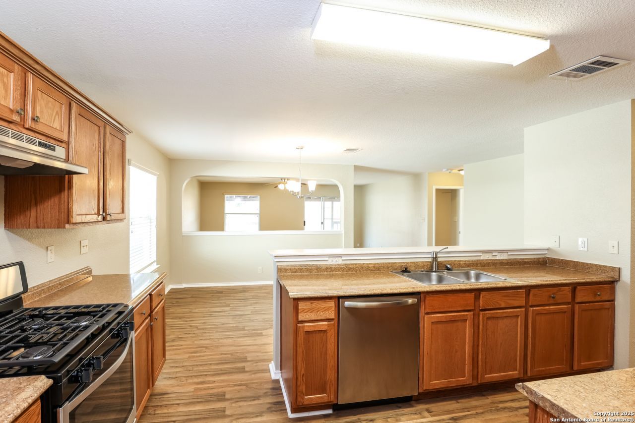 Welcome home to this beautifully refreshed property featuring an inviting front porch and a spacious covered back patio-perfect for entertaining or relaxing outdoors! Inside, enjoy a bright and open floor plan with brand-new flooring throughout and fresh interior paint. This carpet-free home offers two versatile living areas, ideal for a home office, formal dining, or additional living space. The open kitchen includes a gas range for those who love to cook, a cozy breakfast area, and a refrigerator that stays. The split primary suite provides extra privacy and features a garden tub, separate shower, and walk-in closet. Additional highlights include a new roof (2020) and plenty of room to gather with family and friends in the backyard. Conveniently located near schools, shopping, and major highways-this home is a must-see!