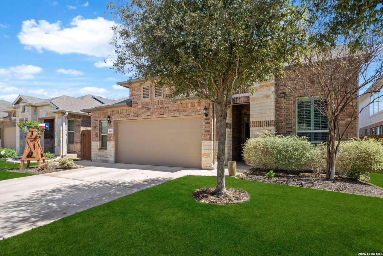 Welcome to your backyard oasis!! This beautifully maintained two-story home offers the perfect blend of style, comfort, and functionality in the sought-after Stillwater Ranch. Featuring a stunning four-sided brick exterior with a striking stone and brick combination, this home delivers exceptional curb appeal from the moment you arrive. Step inside to a grand entry with soaring ceilings, elegant wall detailing, and a warm, inviting feel that flows seamlessly into the open-concept living space. The spacious living room is filled with natural light and opens to a chef-inspired kitchen complete with a massive center island, granite countertops, stainless steel appliances, abundant cabinetry, and a breakfast bar-perfect for entertaining or everyday living. The thoughtfully designed layout offers generous living spaces and comfortable bedrooms, while the neutral tones and quality finishes make it truly move-in ready. Enjoy outdoor living at its finest with a hot tub, extended deck feature, covered patio featuring a built-in fireplace-ideal for relaxing evenings or hosting guests year-round. The backyard backs to a peaceful greenbelt, providing added privacy and serene views with no rear neighbors. Additional highlights include permanent LED exterior lighting for year-round ambiance and convenience, a spacious 2.5 car garage, and a beautifully maintained yard. This home combines modern features, timeless design, and an unbeatable setting-dont miss the opportunity to make it yours! Conveniently located near shopping centers, restaurants, several HEBs, Loop 1604, Hwy 151, Westover Hills medical center, Capital Group, Hartford, Wells Fargo, Microsoft (data centers), JP Morgan Chase, QVC, NSA/Texas and Sea World.
