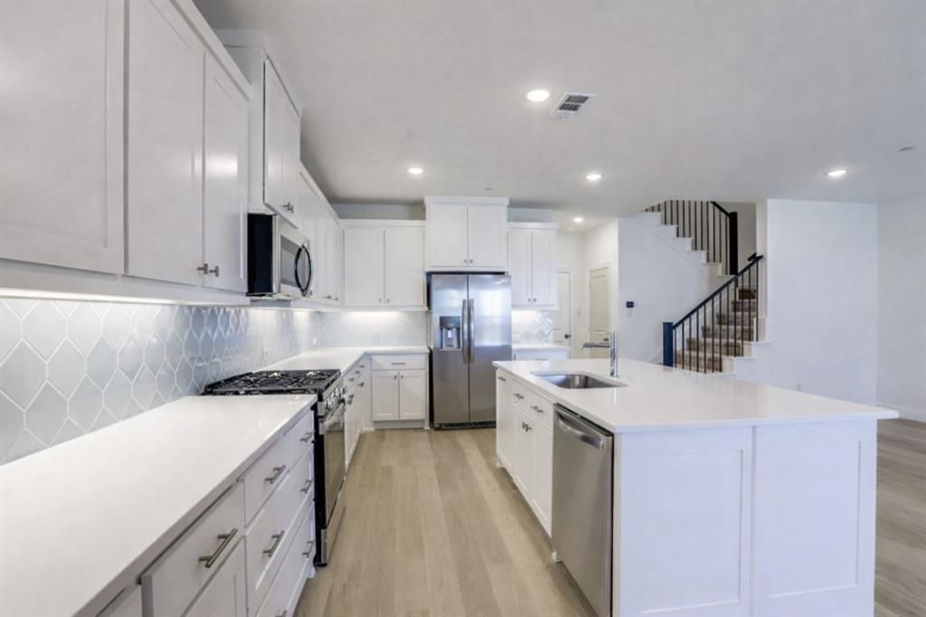 Welcome to this beautifully maintained, east-facing luxury townhome offering 3 bedrooms, 2.5 bathrooms, and a spacious game room in one of Frisco’s most desirable locations near Main St & Preston Rd. Built just one year ago and owner-occupied since, this home is in exceptional condition and ready for its next residents.Enjoy a bright, open-concept floor plan featuring high-grade RevWood flooring throughout the main level, a gourmet kitchen with quartz countertops, oversized island, stainless steel gas appliances, and custom cabinetry—perfect for entertaining and everyday living.The luxurious primary suite offers a spa-like bathroom with dual vanities, oversized walk-in shower, and a large walk-in closet. Secondary bedrooms are generously sized and include ceiling fans with remote controls. The upstairs game room is enhanced with full gym mirrors, ideal for fitness or recreation.Premium upgrades and features include:• Tesla wall charger in oversized garage• Whole-home water softener• Tankless water heater• Reverse Osmosis (RO) drinking water system• Google Nest video doorbell• Living room TV wall-mount ready setup• Refrigerator, washer, and dryer includedPerfectly located within walking distance to the elementary school and directly across from a community park. Minutes from Frisco Square, Downtown Frisco, shopping, dining, and major highways.
