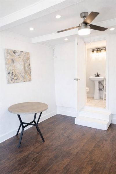 Charming and thoughtfully designed 200 sq ft studio in the heart of North Oak Cliff! This bright and inviting space features rich dark wood floors, a large front-facing window that fills the room with natural light, and a ceiling fan for added comfort. The functional kitchenette offers convenient cabinet storage, while the updated private bathroom showcases a sleek, modern tiled walk-in shower. Perfect for low-maintenance living just six minutes from Bishop Arts, dining, and shopping cozy, clean, and move-in ready!
