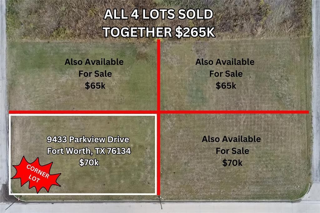 Investor-Developer Opportunity in Crowley, TX! Located at 9433 Parkview Drive, this prime corner lot is being sold together with 3 adjoining lots for a total package price of $265,000. Offering ample space and frontage, this combined property is ideal for residential development, a builder's project, or a long-term investment. Buyer to verify zoning and usage. Situated in a growing area with easy access to major roads and local amenities, the possibilities are wide open. Don’t miss your chance to secure four contiguous lots