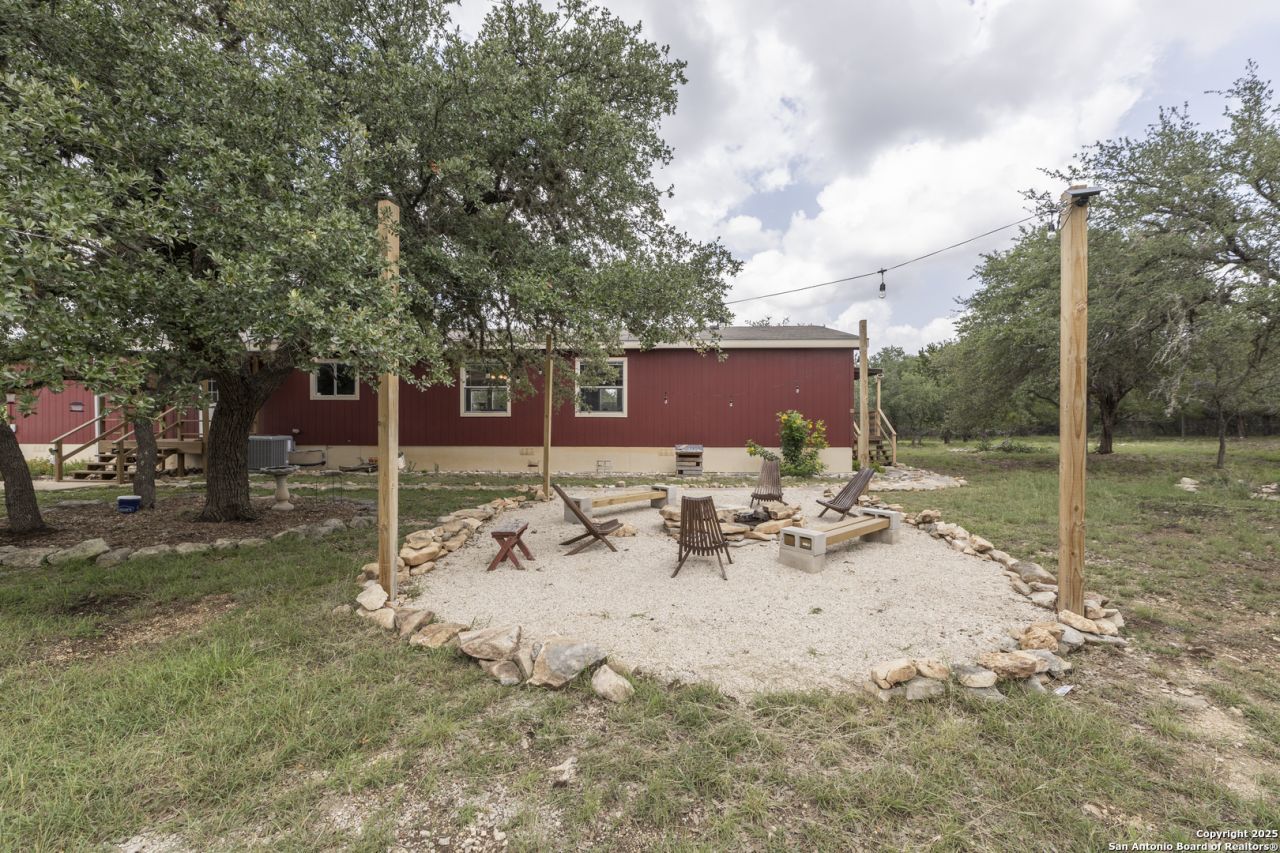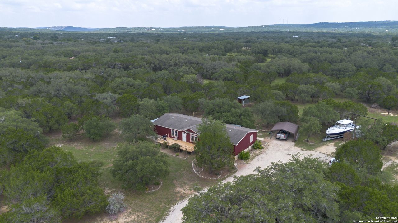 Peaceful Hill Country living on 5.14 private, fully fenced acres! This 4-bed, 2-bath, 2,356 sq ft manufactured home (FHA/VA ready) features an open-concept kitchen, two living areas, and two dining spaces. The oversized primary suite includes private outdoor access, a walk-in closet, and a wheelchair-accessible walk-in shower. Secondary bedrooms offer generous space for family or guests. Enjoy wildlife views from the large front porch or the covered back patio. The property includes a covered carport, multiple open and enclosed sheds, a fire pit area, and primarily flat land-perfect for horses, cattle, or a workshop. A brand-new AC unit was installed this year for year-round comfort. Located in a quiet, gated community near Medina Lake with no HOA restrictions. Ideal for retirees, homesteaders, remote workers, or anyone seeking space and privacy. Beautiful night skies, mature live oaks, and room to spread out-dont miss this rare Hill Country retreat.
