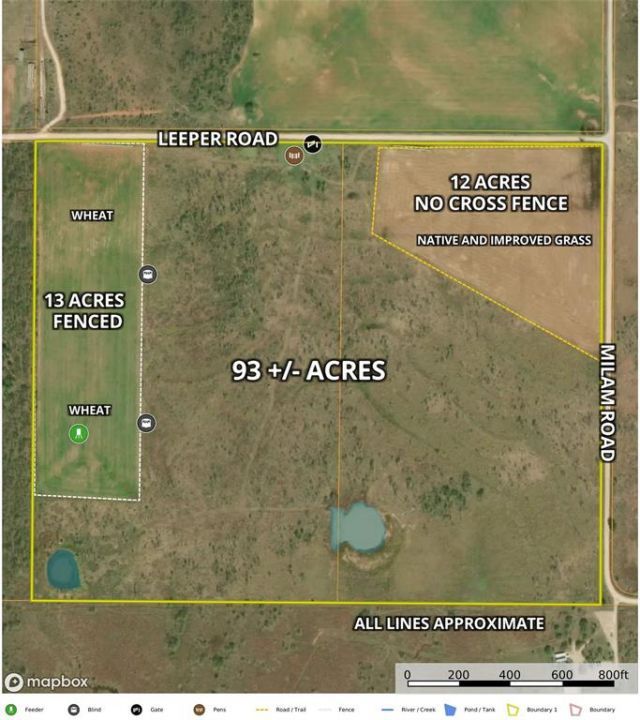 This 93 acre tract is a good combination of hunting and ranching. With a mix of cover and improved pasture. This fantastic piece of land also has a 14 acre Wheatfield, two ponds, views for miles and miles in three directions. Offering a versatile blend of native pasture, improved grasses, cultivated acreage, and two ponds, making it ideal for recreational use, livestock, or future homesite development. Located at the intersection of Leeper and Milam Roads, this property has rural appeal with practical access to utilities and water resources. Good cattle pens and fencing. Wildlife & Recreation: Excellent habitat for deer and feral hogs. This property is well-suited for hunting or weekend getaways. Wildlife photos available upon request. Native & Improved Grasses: Approximately 12 acres in the northeast corner were planted in a mix of native and improved grasses under NRCS guidance about four years ago. While the cross-fencing has been removed, corner posts remain for potential reinstallation.Cultivated Wildlife Plot: A 13-acre rectangular field along the west boundary has historically been planted in wheat to attract wildlife. This area is fenced and includes gates for easy access to the rest of the property.Ponds: Two ponds on the property hold good water. Fencing: Perimeter fencing is in place, with internal fencing removed for improved pasture use. Gates are positioned for efficient access between sections.Gravel road does have electric.
